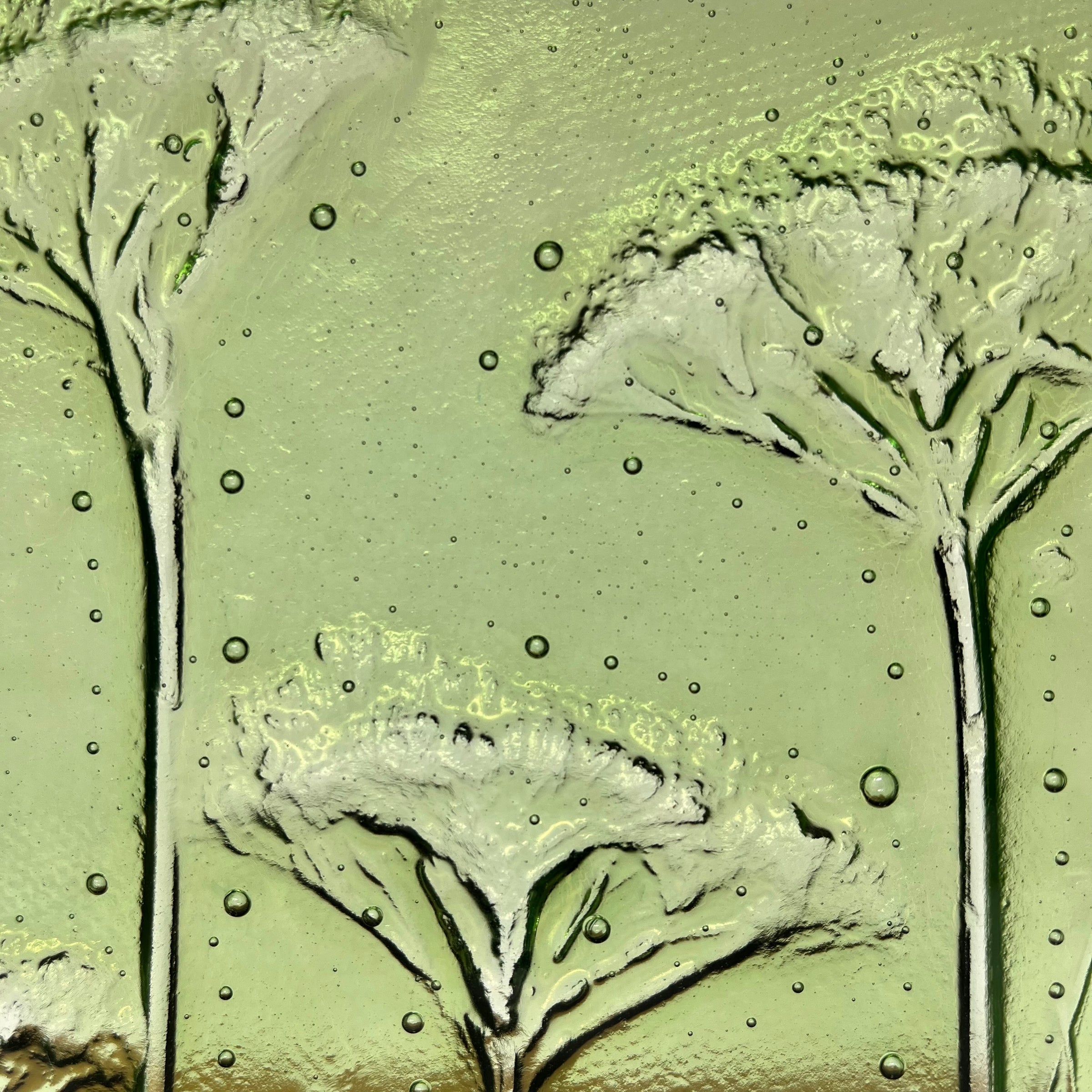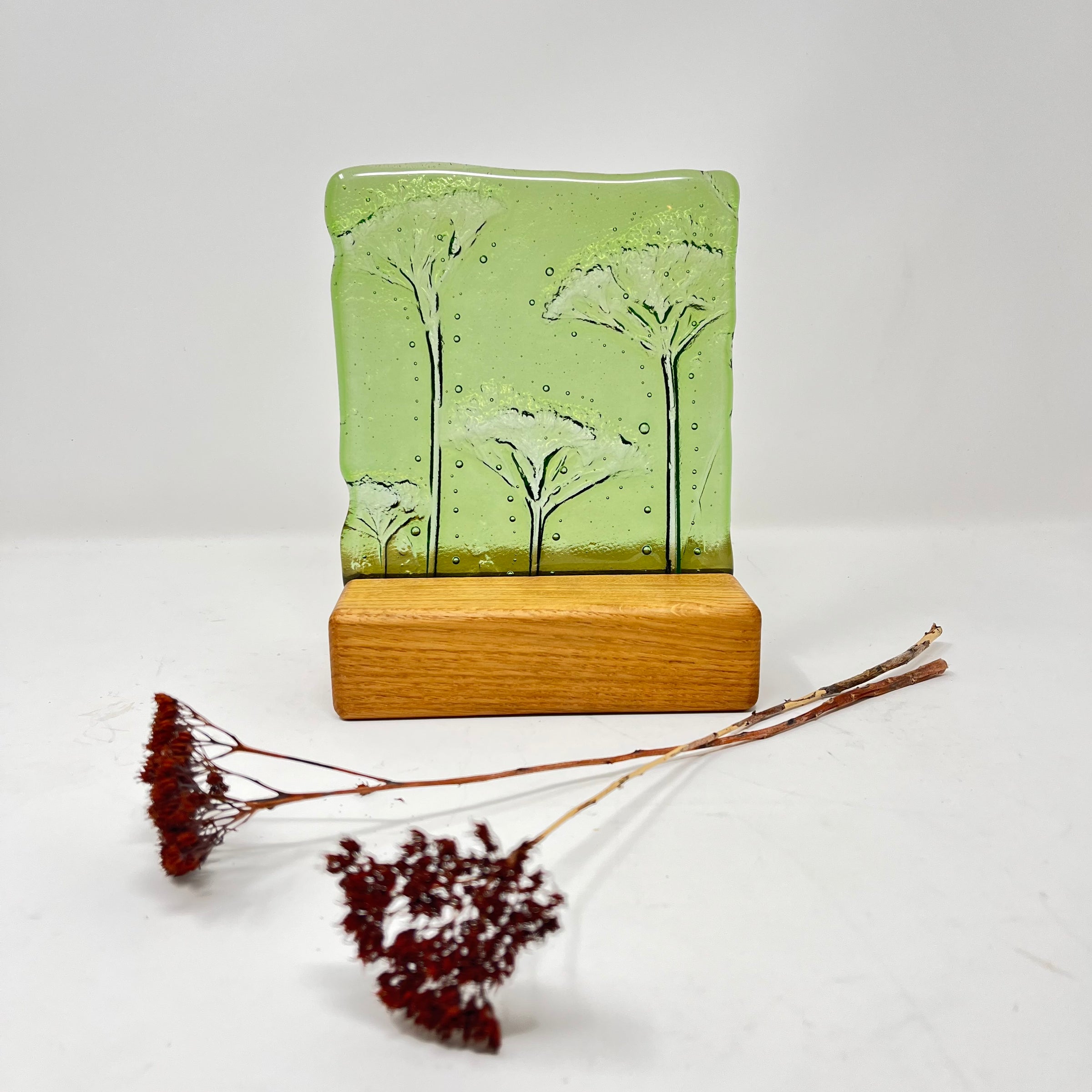 Iridised glass with hollow relief of dried seed heads in an oak block. Ideal for a sunny window sill or candle.