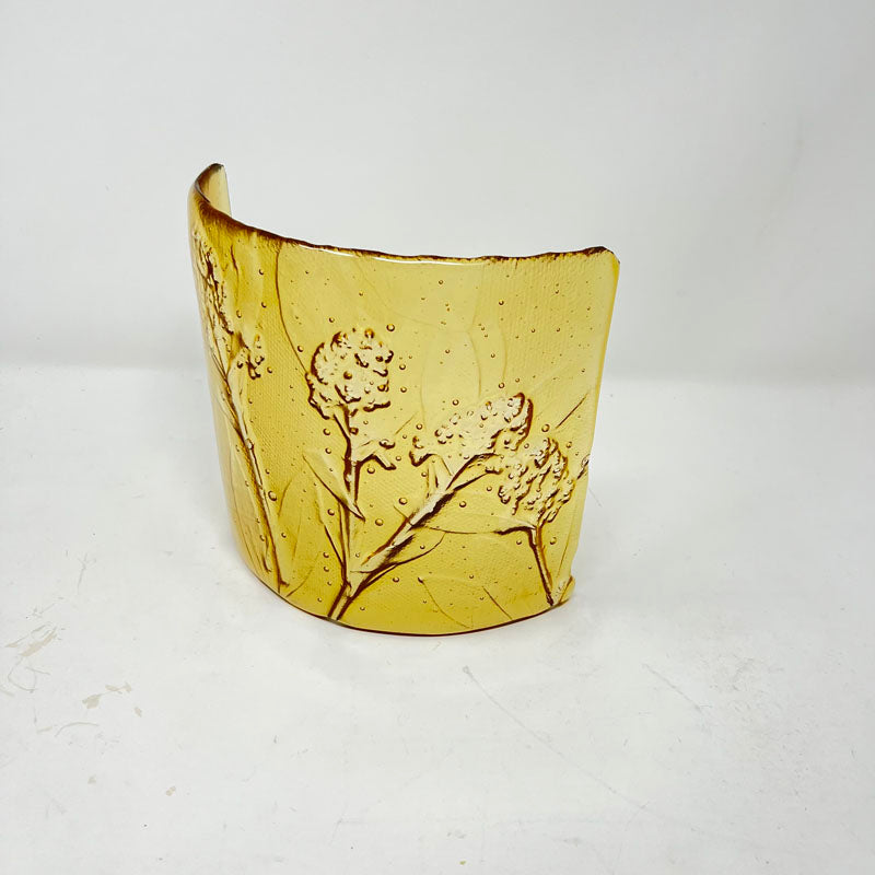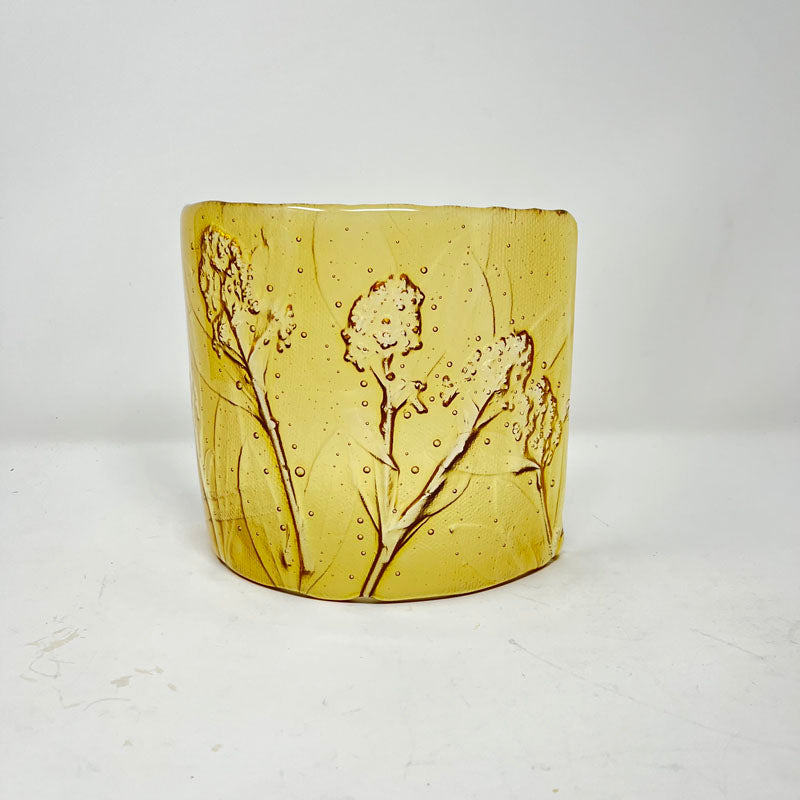 Iridised glass with hollow relief of winter berry bush. Ideal for a sunny window sill or candle.